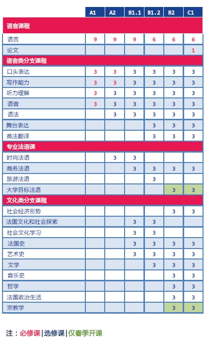 项目语言课程内容:1. 每周21小时课程2. 入学后进行法语水平测试,根据学生法语水平进行分班教学(A1-C1等级)3. 小班教学,每班学生不超过20人4. 除基础法语语言课程,还设有法国历史、艺术、文学、社会等法国文化相关课程。