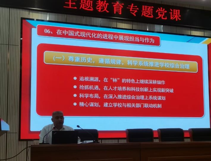 2023年5月23日上午,学校党委委员、副校长闫文德在林学院报告厅讲授了“在中国式现代化进程中彰显中南林担当”的专题党课。
