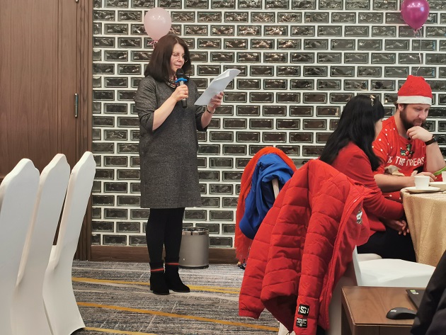 外籍文教专家代表Alina致辞,她表示,感谢学校每年为外籍专家举行温馨的迎新暨圣诞晚会,有机会让她们和其他外籍老师共度佳节,增进交流。此外,她还分享了今年的教学成绩及在中国生活二十年的感受。