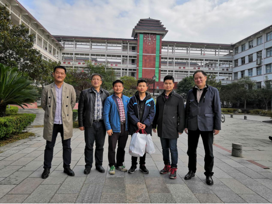 2018年11月30日,全体同志从长沙出发,风尘仆仆赶到通道县,同志们顾不上吃中饭,和有关企业负责人一起首先来到通道县一中看望在学校读高二的孤儿杨水朋同学,并与他的班主任陆居金老师进行了详谈,在了解到杨水朋的学习成绩在全年级前50后,大家都很高兴,纷纷鼓励小杨同学并希望他努力考上中南林业科技大学。随后同志们把精心购买的羽绒服、羊毛衫和防风保暖裤送给了小杨同学,企业负责人蒋先生也表示愿意为小杨同学提供实习、就业岗位,一方面解决具体困难,一方面锻炼小杨同学自力更生的意识。