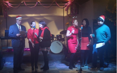 自助晚宴与文艺汇演同时进行。文艺汇演形式多样,以乐队表演拉开帷幕,随后呈现的既有含中华元素的民乐合奏、书法、国画表演,也有外籍文教专家代表外文歌曲合唱、圣诞知识抢答游戏、西洋乐器萨克斯独奏等节目。其中,由音乐学院教师代表石长俊萨克斯演奏的一曲《回家》,将晚会推向了高潮,在场的领导嘉宾、演职工作人员纷纷加入到表演之中。